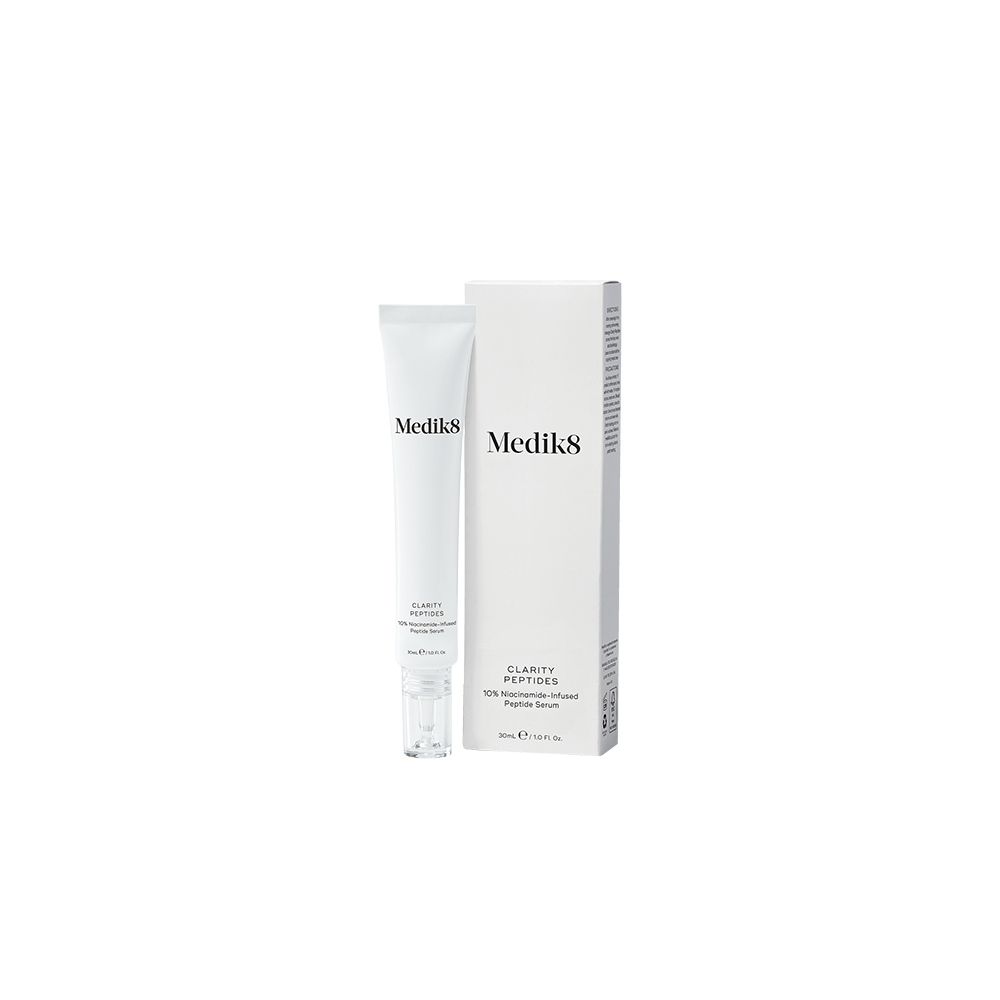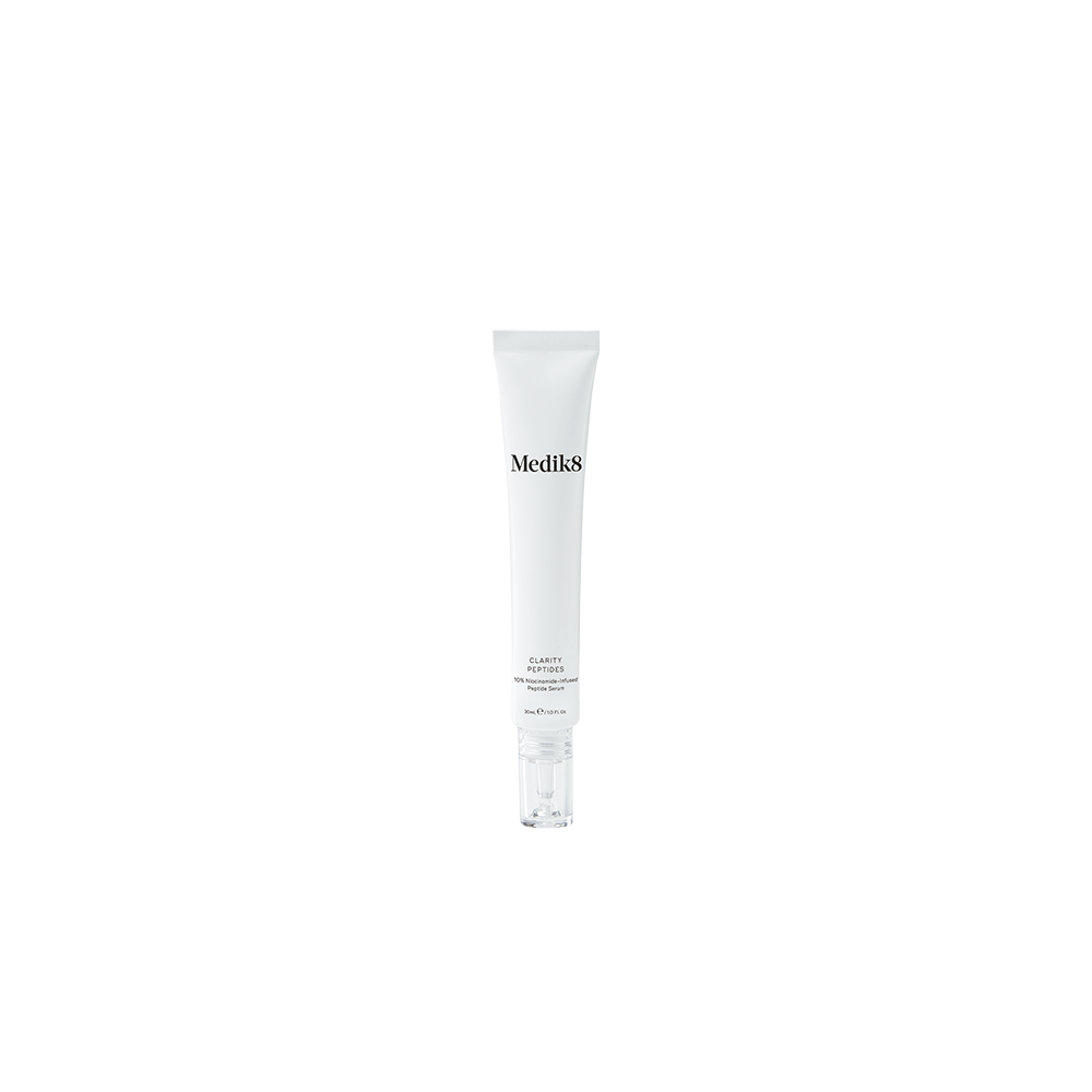 El resultado es una piel con un tono desigual y la reducción de su luminosidad natural. Para combatir este problema, Medik8 ha creado el suero Clarity Peptide, que contiene un 10% de niacinamida, como ingrediente estrella de su composición.